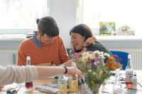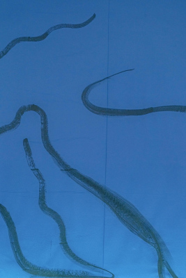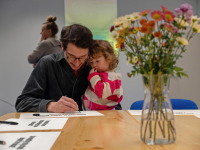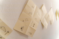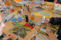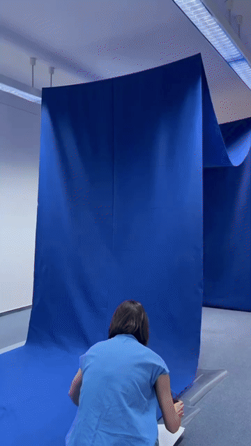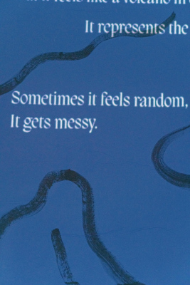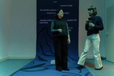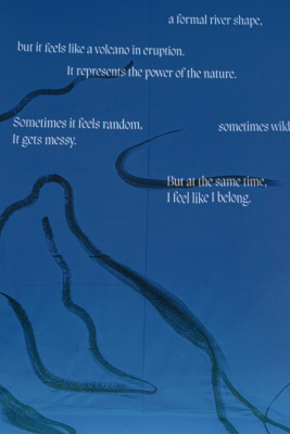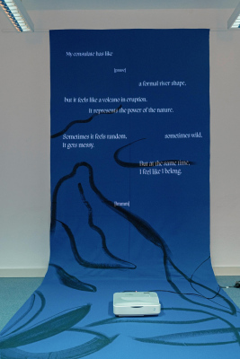 An installation brings these shared ideas into a physical space. A 20-meter blue felt piece, hand-drawn with text fragments, collects memories from the workshops and guides visitors through collective imagination. A calm soundscape mixes animal voices with forest recordings from Europe and Brazil, helping visitors step into other perspectives. In a small reading area, four booklets turn workshop exercises into short stories about identity, belonging, and multispecies relations.